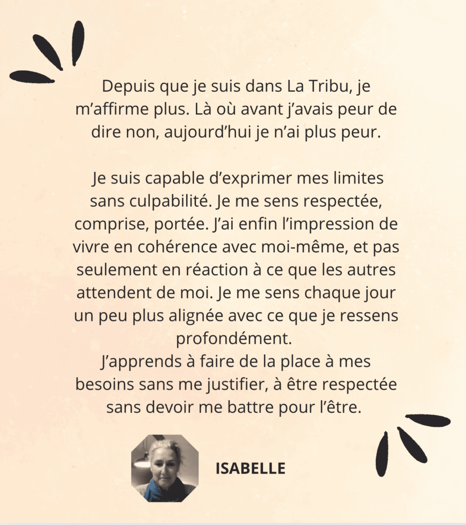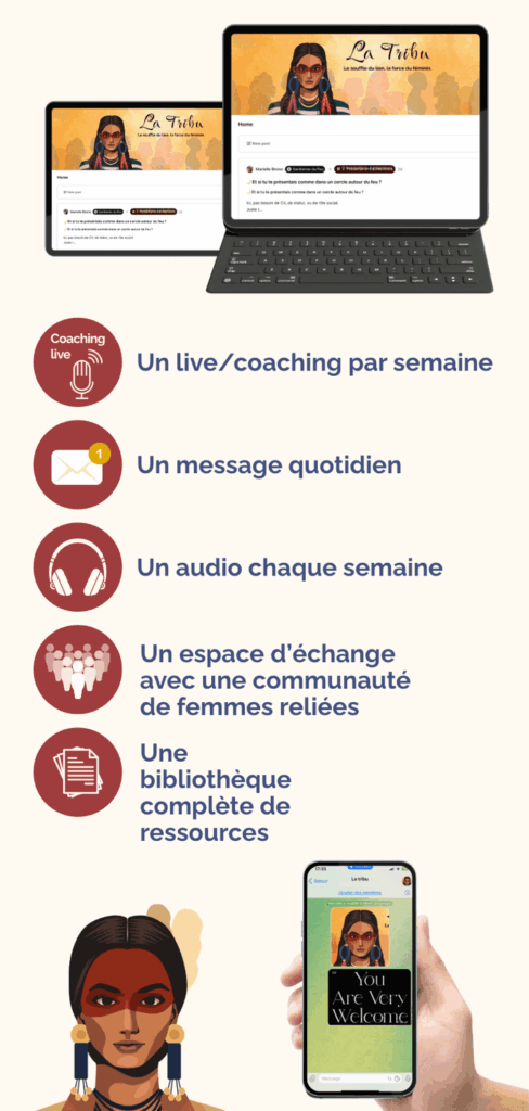La Tribu est une méthode pour retrouver ta confiance, t’affirmer avec douceur, et transformer ta vie relationnelle sans te faire violence. Un espace quotidien de soutien, de ressourcement et de transformation, pour cesser de te sentir seule ou perdue dans un monde qui te demande toujours plus.